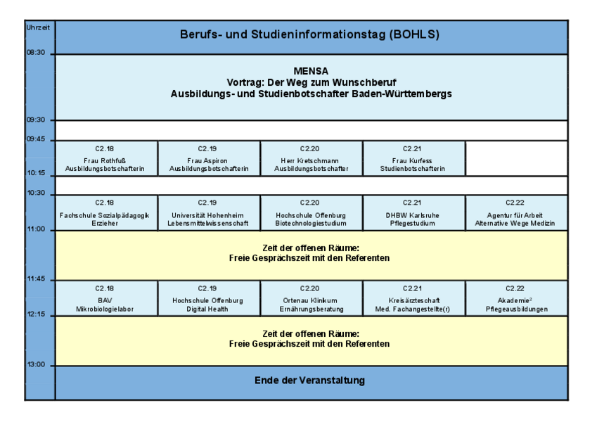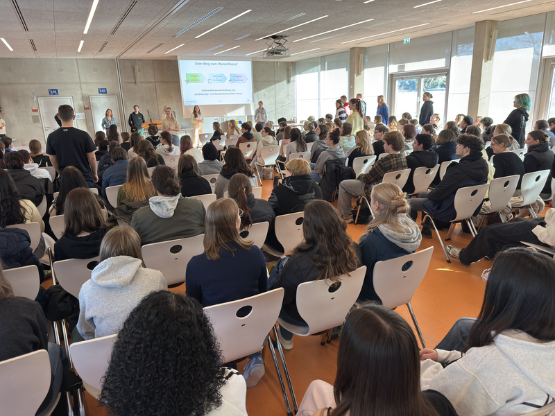 Nach dem Ankommen in der Mensa ging es direkt in die erste Inforunde, bei der sich die Schülerinnen und Schüler zu Vorträgen und Fragerunden je nach Neigung und Interesse anmelden konnten. Egal ob Pflege, Erziehung, Verkauf, Handwerk - die Auswahl war groß.